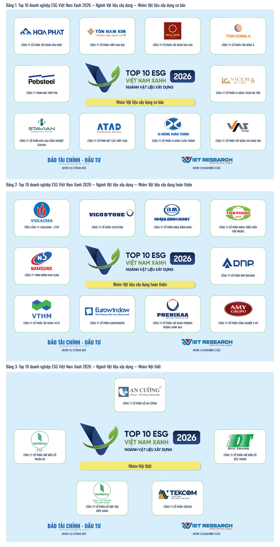 CÔNG BỐ TOP 10 DOANH NGHIỆP ESG VIỆT NAM XANH 2026 – NGÀNH VẬT LIỆU XÂY DỰNG Trong khuôn khổ Chương trình Nghiên cứu về việc cam kết và thực hiện ESG trong các ngành kinh tế chủ lực năm 2026, Viet Research...
